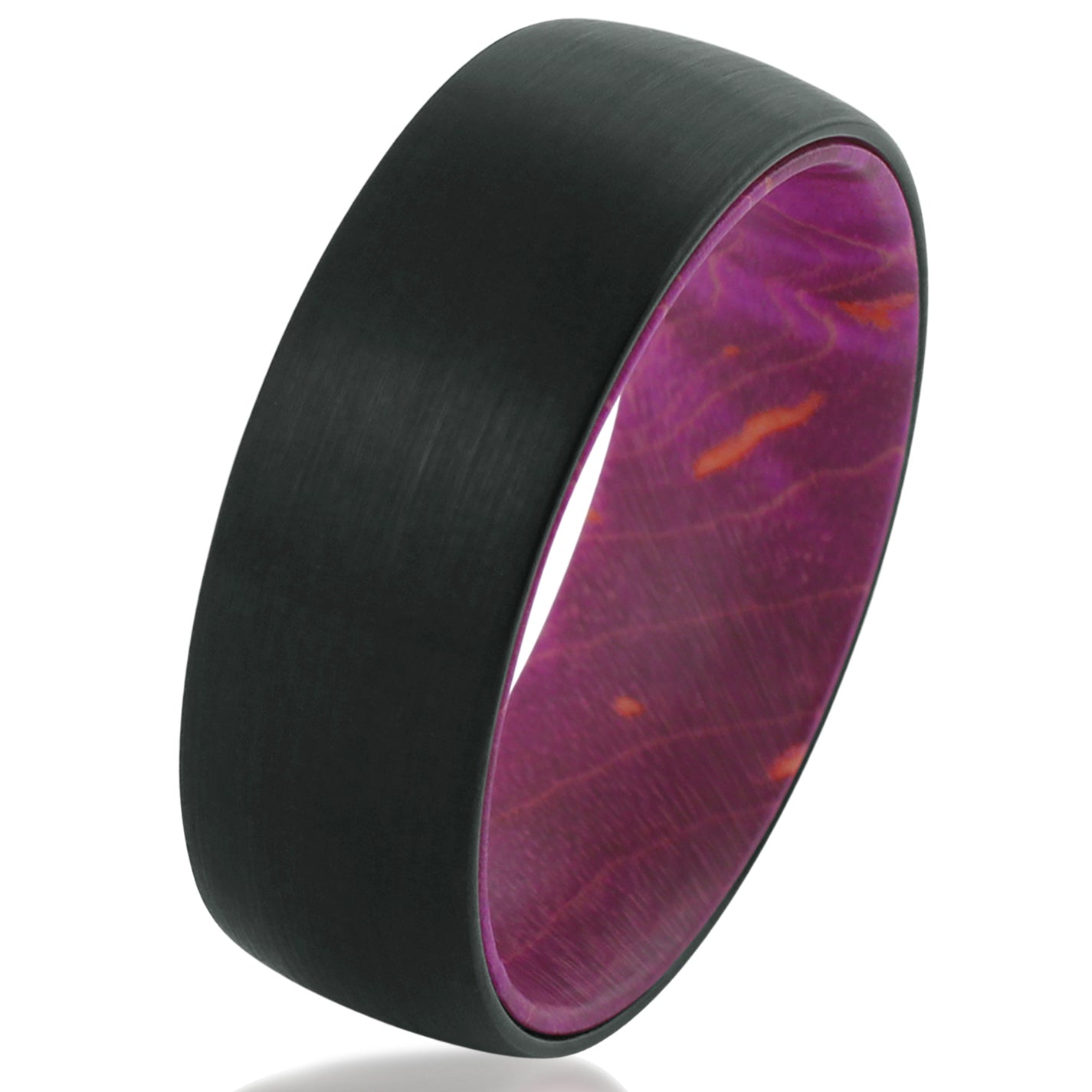 This elegant Black Tungsten low dome ring features a satin brushed finish paired with a striking Maroon Red Box Elder Wood inner sleeve. The contrast of sleek black tungsten and bold maroon wood creates a unique and stylish look. Crafted from premium tungsten, this ring is built for unmatched durability and long-lasting shine. Perfect as a wedding band, anniversary gift, or statement piece, it blends modern elegance with natural character. Make a lasting impression with this timeless design.